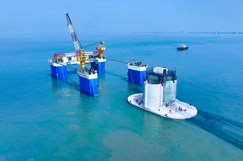 由於施工作業範圍與已建四區圍堤和禾港碼頭距離較近,桶體安裝可作業水域受限,傳統的桶體雙船對拉拖帶定位安裝工藝無法滿足現場施工需求。面對這一技術瓶頸,專案團隊通過反復論證、實地考察學習與現場試驗,創新研發出起重船助浮拖帶定位下沉的桶體安裝工藝。該工藝探明了起重助浮機理,創新了桶體氣浮轉向和助沉關鍵技術,拓展了桶體安裝方法,增強桶體適應性,為桶體的推廣應用提供了“三航樣板”。