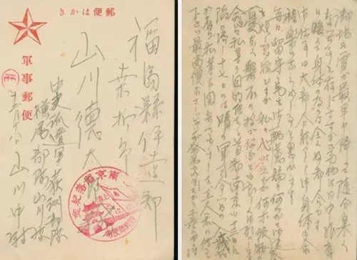一件是侵华日军中尉山川仪仁于1937年12月18日寄往日本福岛县山川德太郎的战地信件。信封正面清晰盖有“南京陷落纪念”邮戳。信中,日军的嚣张气焰跃然纸上:“……我们的目的地,首都南京,终于在13日被我们攻占了。在17日举行了盛大的军司令官入城式,我们接受了检阅。请告诉正人君,我发现了最贵的麻将,我将作为特产送给他。”
