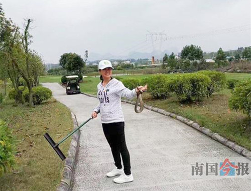 4月10日下午,记者见到了视频抓蛇的年轻女子。她叫覃江丽,现年30岁,来自柳城县社冲乡,是柳州市一家高尔夫俱乐部的一名员工。她的本职工作是高尔夫球场的出发员,负责客人出发、登记、安排球童等工作,已经入职两年多。