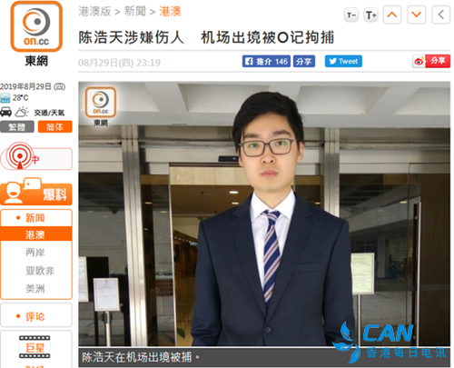 另据香港“东网”报道,据悉陈浩天涉嫌伤人,其离境前往日本东京时被香港警方有组织罪案及三合会调查科(俗称O记)人员拘捕。警方30日向环球时报-环球网记者透露,陈浩天涉嫌“参与暴动”及“袭警”,正被扣留调查。