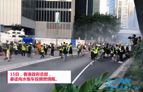 十五日,香港大量示威者违法集结于香港街头,再次对地铁站进行破坏,朝港府总部抛掷汽油弹等危险品。在港警2次对示威者进行口头警告无效后,警方出动水炮车,有暴徒朝一辆水炮车投掷汽油弹,致水炮车顶部着火。