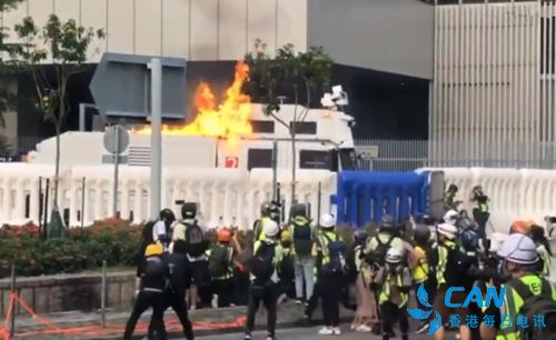 香港每日电讯讯(CAN记者 蔡杨毅)十五日,香港大量示威者违法集结于香港街头,再次对地铁站进行破坏,朝港府总部抛掷汽油弹等危险品。在港警2次对示威者进行口头警告无效后,警方出动水炮车。有暴徒朝一辆水炮车投掷汽油弹,导致水炮车顶部着火,有港媒称,火势燃烧约1分钟后熄灭,车身似并无大碍。