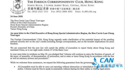 近日,香港外国记者会(FCC)向香港特区行政长官林郑月娥发公开信,称担心“港区国安法”会影响新闻自由,要求特区政府作11项保证。