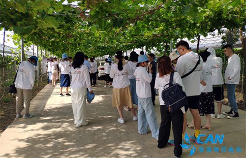采访团走进了河南杰美农业科技有限公司,映入眼帘的便是一座座的葡萄温棚,一串串绿色的葡萄悬挂于棚中,长势喜人。据悉,该公司现拥有葡萄种植示范及果树苗木繁育基地500余亩,建造完成葡萄温棚12座、葡萄避雨棚344座、恒温库一座,并配套建成滴灌和水肥一体化灌溉系列设施,完成了葡萄长廊及办公和生活用房等配套实施建设,是目前豫南地区规模较大的葡萄产业化基地。