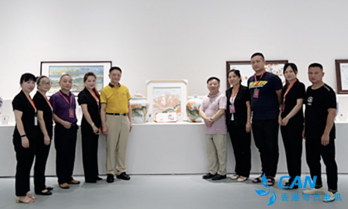 致公党中央办公厅主席办主任陈文良(前排右二)一行来到“瓷碗”展厅调研,友邦公司董事长、香港美协会长胡正魁(前排右一)中国陶瓷设计艺术大师王采(右3)一起陪同调研