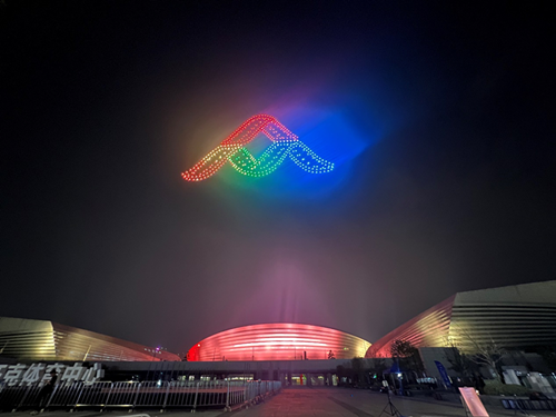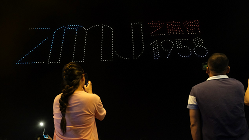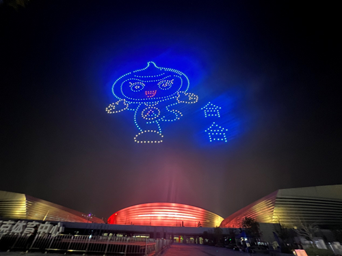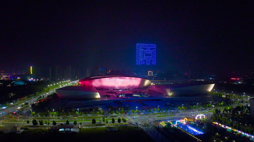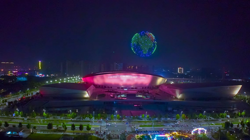 9月14日晚上郑州市奥体中心附近热闹非凡,大人举着手机,小孩欢呼雀跃,大家都在兴奋地仰头望向上空,500架无人机浩浩荡荡、色彩缤纷,井然有序地变换着不同的画面。
