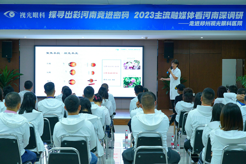 5月23日下午,40家媒体编辑记者们在医院三楼讲堂,聆听了一场生动又干货满满的眼健康科普知识。主讲人是郑州视光眼科医院的院长、国务院特贴专家、眼科学博士刘苏冰教授。