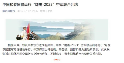 据中国国防部网站2日消息,中泰“鹰击-2023”空军联合训练将于7月在泰国空军乌隆基地举行,这是中泰两国空军第六次开展联合训练。2日接受《环球时报》记者采访的专家表示,泰国与中国的军事合作在东盟国家中是最高级别的,这有助于提升中泰两国联手应对安全挑战的能力,同时也为中国和东盟其他国家进行相关合作树立了典范。