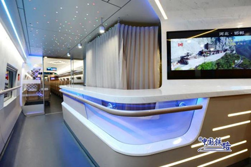 该动车组实现“5G+Wi-Fi”网络全覆盖,部分车厢内部设置智能交互终端,可提供高铁娱乐、无线投屏等服务,满足旅客在旅途中看电影、听音乐的娱乐需求。值得一提的是,该列车专门设置了无障碍车厢,加宽到90厘米的通过门、无障碍卫生间、轮椅放置区域等可为重点旅客出行提供方便。此外,该车厢还在座椅、轮椅固定处和卫生间等便于视障旅客触摸的区域设置盲文标识,为重点旅客乘车提供便利。
