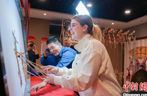 图为来自意大利的文旅达人爱琳娜体验皮影。马铭言 摄