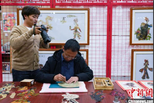 图为皮影行家靳永红雕刻皮影。马铭言 摄