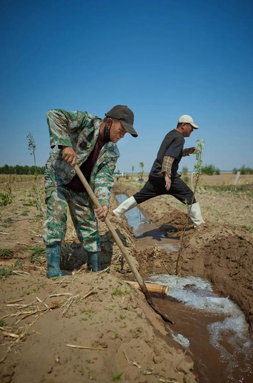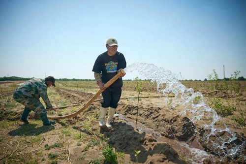 5月初正是内蒙古春耕的忙碌时节,农民们忙着在地里给新种的幼林浇水