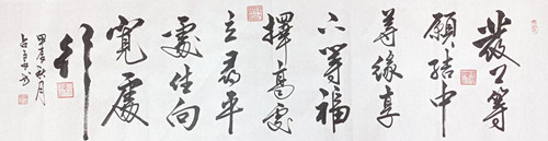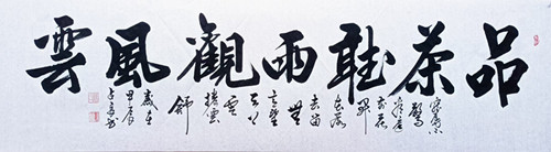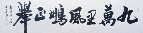陈占良的行书书法,“稳不俗、险不怪”,稳中求险,险中见稳。随遇而变,独出机巧,放开处,一泻千里;收缩处,凝重沉郁。飞白处,形如枯草;浓黑处,泼墨如雨。可谓:思飘云物外,情入字幅中。