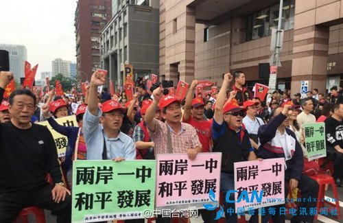 集会时民进党中常会正在举行。张安乐说,选择这个时机来此地,就是要告诉即将执政的民进党,台湾还有一个声音是坚持“九二共识”。