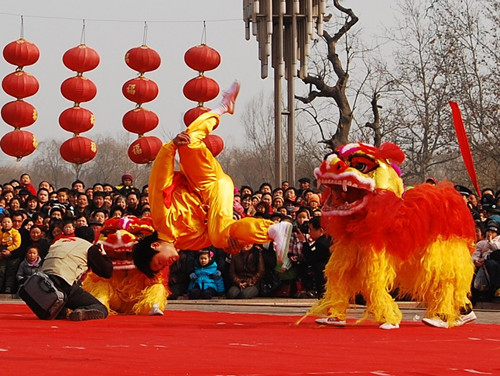 舞狮子,是我国优秀的民间艺术,每逢元宵佳节或集会庆典,民间都以狮舞前来助兴。这一习俗起源于三国时期,南北朝时开始流行,至今已有一千多年的历史。据传说,它最早是从西域传入的,狮子是文殊菩萨的坐骑,随着佛教传入中国,舞狮子的活动也输入中国。狮子是汉武帝派张骞出使西域后,和孔雀等一同带回的贡品。而狮舞的技艺却是引自西凉的“假面戏”,也有人认为狮舞是五世纪时产生于军队,后来传入民间的。两种说法都各有依据,今天已很难判断其是非。不过,唐代时狮舞已成为盛行于宫廷、军旅、民间的一项活动。唐段安节《乐府杂寻》中说:“戏有五方狮子,高丈余,各衣五色,每一狮子,有十二人,戴红抹额,衣画衣,执红拂子,谓之狮子郎,舞太平乐曲。”诗人白居易《西凉伎》诗中对此有生动的描绘:“西凉伎,西凉伎,假面胡人假狮子。刻木为头丝作尾,金镀眼睛银帖齿。奋迅毛衣摆双耳,如从流沙来万里。”诗中描述的是当时舞狮的情景。