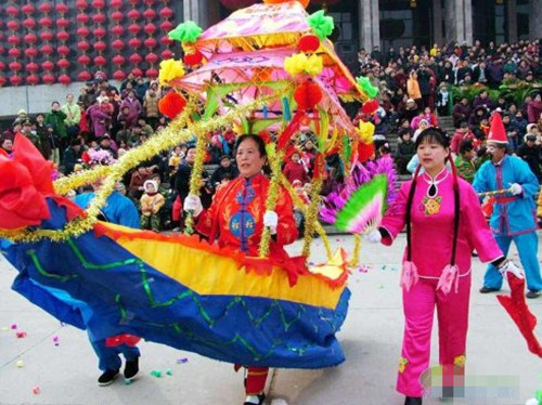 划旱船,民间传说是为了纪念治水有功的大禹的。划旱船也称跑旱船,就是在陆地上模仿船行功作,表演跑旱船的大多是姑娘。旱船不是真船,多用两片薄板,锯成船形,以竹木扎成,再蒙以彩布,套系在姑娘的腰间,如同坐于船中一样,手里拿着桨,做划行的姿势,一面跑,一面唱些地方小调,边歌边舞,这就是划旱船了。有时还另有一男子扮成坐船的船客,搭档着表演,则多半扮成丑角,以各种滑稽的动作来逗观众欢乐。划旱船流行于我国很多地区。