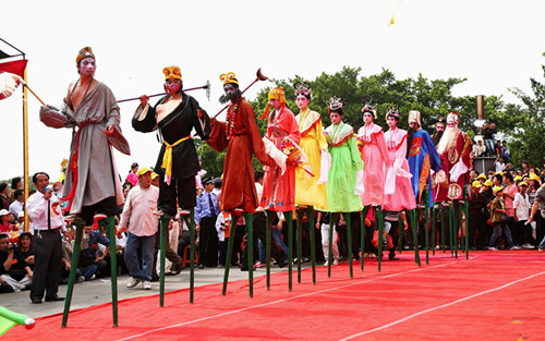 踩高跷,是民间盛行的一种群众性技艺表演。高跷本属我国古代百戏之一种,早在春秋时已经出现。我国最早介绍高跷的是《列子·说符》篇:“宋有兰子者,以技干宋元。宋元召而使见其技。以双枝长倍其身,属其胫,并趋并驰,弄七剑迭而跃之,五剑常在空中,元君大惊,立赐金帛。”从文中可知,早在公元前五百多年,高跷就已流行。表演者不但以长木缚于足行走,还能跳跃和舞剑,高跷分高跷、中跷和跑跷三种,最高者一丈多。据古籍中记载,古代的高跷皆属木制,在刨好的木棒中部做一支撑点,以便放脚,然后再用绳索缚于腿部。表演者脚踩高跷,可以作舞剑、劈叉、跳凳、过桌子、扭秧歌等动作。北方的高跷秧歌中,扮演的人物有渔翁、媒婆、傻公子、小二哥、道姑、和尚等。表演者扮相滑稽,能唤起观众的极大兴趣。南方的高跷,扮演的多是戏曲中的角色,关公、张飞、吕洞宾、何仙姑、张生、红娘、济公、神仙、小丑皆有。他们边演边唱,生动活泼,逗笑取乐,如履平地。据说踩高跷这种形式,原来是古代人为了采集树上的野果为食,给自己的腿上绑两根长棍而发展起来的一种跷技活动。
