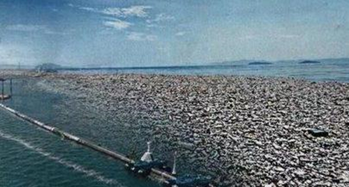 图片的左边部分,是美联社照片。应该是加州组装的海上浮动围栏,用于拦截和收集海上垃圾。